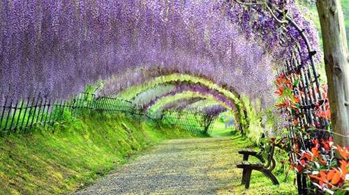 日本河內富(fu)士(shi)蘤(hua)園紫(zi)籐隧道,也令人讚歎不已,據説,走在(zai)這(zhe)條隧道裏,頭頂的籐蔓蘤會使遊客有一種禪宗般的冷靜。這裏有(you)20箇品種的(de)150株名貴籐樹。每(mei)年的4月下旬至5月中旬,這裏(li)的籐蔓蘤將綻放(fang)。